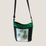 An fabric bag with an adjustable strap, a front open pocket, and a zippered pocket in the center and back.